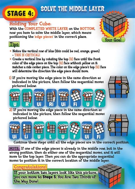 3. The Middle Layer : Now, it’s time to solve the middle layer. This involves getting the four edge pieces in the middle layer into their correct positions. This step requires two more algorithms, and you’ll use one or the other depending on which edge piece you want to move. The goal is to insert these edge pieces between the correct center pieces. This might feel like the most difficult step in the beginner’s method, but don’t worry, you’ll eventually master it.