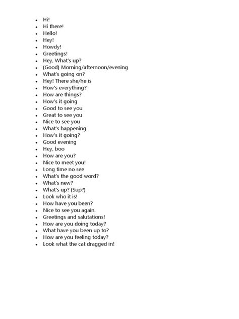 Now, let’s get into the nitty-gritty of casual greetings, the kind you use when you’re just chilling with your pals or hanging out with your family. These are the phrases that make you sound like a true native speaker, not like you just stepped out of an English textbook. First up, we have “Hey!” This is like “hi”’s even cooler, more laid-back sibling. It’s super versatile and works in almost any informal situation. You can use it when you see someone you know walking down the street, when you bump into a friend at the mall, or even to grab someone’s attention across a room. It’s energetic and friendly. Then there’s “What’s up?” or the even shorter, snappier ”‘Sup?” This is a classic slang greeting. It doesn’t actually require a detailed answer about what’s going on in your life; it’s more of a “how are you doing?” in a super casual way. A common reply is “Not much,” “Nothing much,” or “Hey.” It’s all about keeping the vibe chill. Another gem is “How’s it going?” This is a bit more of a question, asking about the general state of things in the other person’s life. It’s friendly and shows you care a little bit more than just a simple “hi.” Replies can range from “Good, you?” to “Not too bad,” or a more detailed update if you’re feeling chatty. “How are you doing?” is also super common and interchangeable with “How’s it going?” Remember, with these casual greetings, the key is the delivery. A relaxed tone, maybe a nod or a wave, makes them sound authentic. Imagine you’re meeting your best friend for coffee. You wouldn’t greet them with a formal “Good morning, it is a pleasure to see you,” would you? Nah, you’d probably walk in and be like, “Hey! What’s up? How’s it going?” See? It flows naturally. These phrases are your secret weapons for sounding more approachable and fitting in with the local lingo. So, next time you’re with your mates, try throwing one of these out. You’ll be surprised how easy it is to connect when you ditch the formality and embrace the casual.