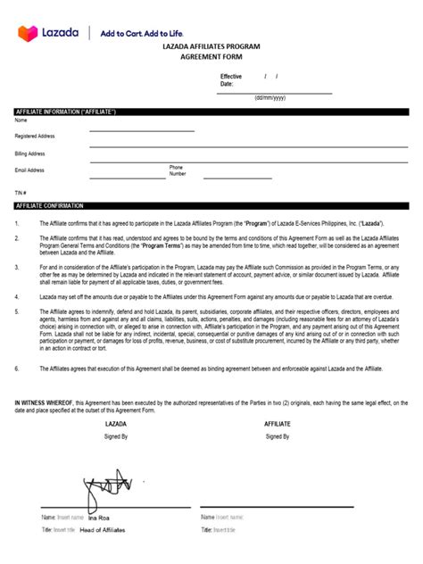 Now, let’s get down to the nitty-gritty: the Lazada Affiliate Program Agreement Form PDF . This document is the legal contract that outlines the terms and conditions of your partnership with Lazada. It’s super important to read and understand this agreement before you start promoting products. Think of it as the rulebook for your affiliate marketing journey. The agreement covers various aspects of the program, including commission rates, payment terms, prohibited activities, and the responsibilities of both parties. It’s crucial to be aware of these details to avoid any misunderstandings or potential violations. The agreement form is usually available for download on the Lazada Affiliate Program website. You’ll likely need to review and accept the terms and conditions during the registration process. Make sure to download a copy of the Lazada Affiliate Program Agreement Form PDF for your records. This way, you can easily refer back to it whenever you have questions or concerns. It’s always a good practice to familiarize yourself with the legal aspects of any business agreement. This will protect you and ensure that your partnership with Lazada is smooth and successful. Understanding the agreement can save you from potential headaches down the line. It’s also a demonstration of your professionalism and commitment to ethical affiliate marketing practices. Always be transparent and honest with your audience, and make sure to comply with all the terms and conditions outlined in the agreement. This will help you build trust with your audience and maintain a positive relationship with Lazada. The more you know about the agreement, the better equipped you’ll be to succeed as a Lazada affiliate. This knowledge is an essential part of your affiliate marketing toolkit and will help you navigate the program with confidence. Remember, you’re building a business, and understanding the legal aspects is crucial for long-term success. So, take the time to read the agreement thoroughly and reach out to Lazada support if you have any questions.
