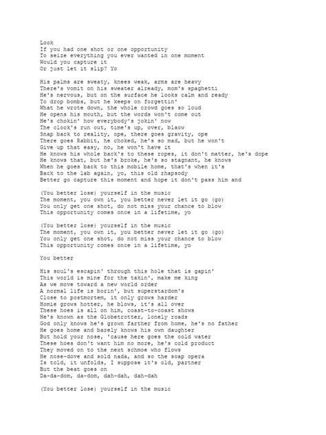 The chorus is where the magic happens, right? “You better lose yourself in the music, the moment / You own it, you better never let it go / You only get one shot, do not miss your chance to blow / ‘Cause opportunity comes once in a lifetime, yo.” This isn’t just a catchy hook; it’s a mantra . It’s a reminder to be present, to grab life by the horns, and to give it everything you’ve got. Lose yourself in the moment, that’s the key! Forget your worries, your doubts, and your fears, and just be in the music, in the moment. And the line, “You only get one shot, do not miss your chance to blow,” is a punch to the gut. It’s a wake-up call, a reminder that time is fleeting, and opportunities don’t always come knocking twice. This chorus isn’t just about rapping; it’s about life. It’s about taking risks, pushing yourself beyond your comfort zone, and chasing your dreams with everything you’ve got. It’s about recognizing that every moment is a chance to make something happen, to create something amazing, and to leave your mark on the world. The repetition of these lines throughout the song reinforces this message, drilling it into your head and reminding you to stay focused and determined.