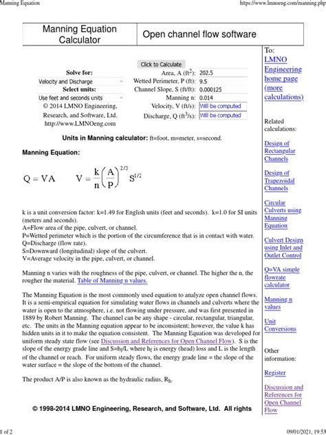 Before we get too excited about the calculator itself, let’s quickly unpack the Manning Equation . This bad boy is fundamental for figuring out the average velocity of a fluid flowing in an open channel, like a river, stream, or even a drainage ditch. It was developed by an Irish engineer named Robert Manning back in the 19th century, and it’s still a go-to for a reason: it works! The equation itself looks like this: V = (k/n) * R^( 2 3 ) * S^( 1 2 ). Don’t let the exponents and variables scare you off, guys. Let’s break ‘em down:
