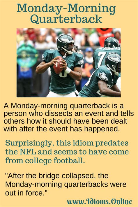 Hey guys! Ever heard someone say, “Oh, he’s such a Monday morning quarterback”? What does that even mean, right? Let’s break down this common idiom and figure out why it pops up so often, especially after something has already happened. Essentially, a Monday morning quarterback is someone who, with the benefit of hindsight, criticizes or offers advice on actions that have already occurred, usually in a way that suggests they would have done better. It’s like they’re replaying the game after it’s over, knowing all the plays that didn’t work, and then confidently saying, “I knew that was a bad idea!” or “They should have done THIS instead!”. This term originates from American football, where a quarterback is the leader on the field, making crucial decisions during the game. A “Monday morning” quarterback, therefore, is someone analyzing the Sunday game after it’s finished, with all the results and consequences laid bare. They aren’t under pressure, they aren’t facing the immediate consequences of a wrong move, and they have the luxury of seeing the entire playbook unfold. It’s easy to be brilliant when the pressure is off and you can replay every single moment, right? This idiom isn’t just about football, though. We see it everywhere – in business decisions, political strategies, personal choices, and even just everyday conversations about what should have been done differently. It’s that friend who tells you after you’ve messed up that they had a feeling it wouldn’t work out, or that colleague who points out the flaws in a project after it’s been launched and faced issues. The key here is the timing and the benefit of hindsight . The Monday morning quarterback operates without the pressure, the incomplete information, and the uncertainty that the original decision-maker faced. It’s a way to acknowledge that it’s far easier to judge and critique when the dust has settled and the outcome is already known. So, next time you hear this phrase, you’ll know it refers to someone offering unsolicited opinions or criticisms on past events, often implying they possess superior judgment or foresight. It’s a classic example of how easy it is to second-guess when you’re not the one in the hot seat!