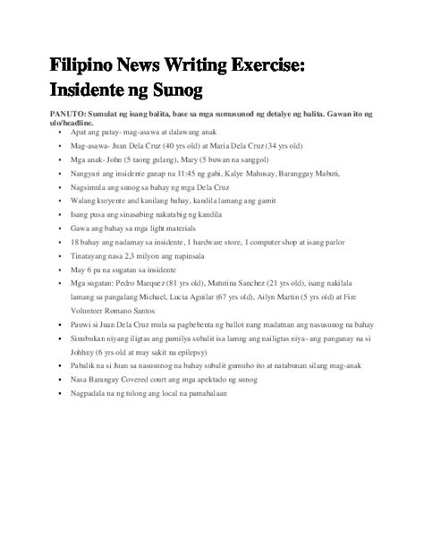 By following these guidelines and practicing regularly, you can develop your skills in news writing in Tagalog and create compelling, informative content for your audience. Remember, the key is to be clear, accurate, and objective, and to always keep your audience in mind.