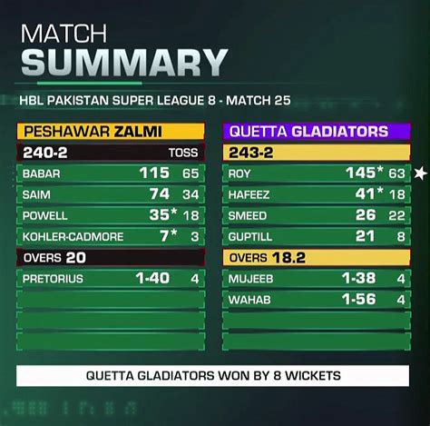 Summarizing the key takeaways, we can recap the standout performances, the pivotal moments, and the strategic battles. Highlighting the key moments and turning points, and reflecting on the individual brilliance of the players is important. The match’s outcome, of course, is the final result. Knowing the outcome is vital to understanding the bigger picture. Whether it was a close contest that went down to the wire or a one-sided affair, the result provides a sense of closure. The match results also provide a basis for future analysis. It shapes the season’s standings. The final score is the ultimate determinant. The teams will learn from their experience, adjust their strategies, and come back stronger in the next match. The match result adds to the excitement and drama of the PSL and provides fans with a lasting memory. The match outcome and final score determine the overall success. The result of the Peshawar Zalmi versus Quetta Gladiators match is not just a conclusion. The result is the beginning of the next chapter in the PSL story.