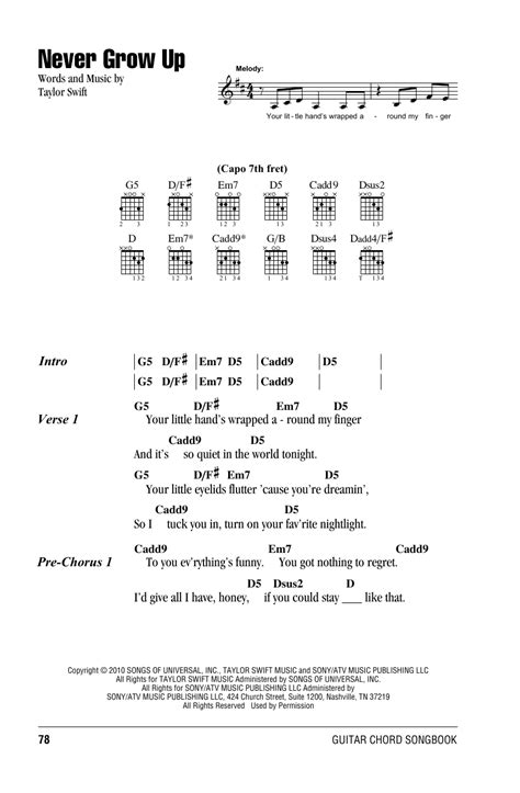 Now, let’s tackle the chorus of “Never Grow Up,” which lifts the song emotionally. The chorus introduces a slight variation that adds a beautiful lift. The progression here is often C - G - D - Em . You’ll see this sequence repeat. For instance: “C - Grow up so fast, G - you don’t D - even notice Em - C”. This change from the verse really opens up the song and gives it that anthemic, yet still intimate, feel. The C to G transition is very smooth, and then you move to the familiar G to D and D to Em. It’s a progression that feels both comforting and a little wistful, perfectly matching Taylor’s lyrical themes. When you play the chorus, you might want to slightly increase your strumming intensity or volume to give it that dynamic lift. Think about putting a bit more emphasis on the downbeats. The core idea is to make the chorus feel a little bigger than the verse, even though the chords are still relatively simple. Again, focus on clean chord changes and a consistent rhythm. Listen to how Taylor emphasizes certain words or phrases; try to mimic that feeling with your strumming. The Em chord at the end of the chorus progression often leads back into the C or directly into the next verse’s G, creating a seamless loop. Mastering this chorus progression is a huge step towards playing the entire song. It’s catchy, it’s emotional, and it’s incredibly satisfying to play. So, keep practicing those transitions and feel the song come alive!