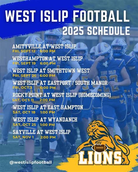 Knowing the West Islip Football game schedule is vital for any die-hard fan. The anticipation of each game, the excitement of the Friday night lights – it’s all part of the experience. But how do you stay in the loop? Luckily, there are several ways to keep track of the Lions’ upcoming battles. The most reliable source is often the official West Islip High School athletic website. This is where you’ll find the most up-to-date schedules, including dates, times, and locations of games. Schedules are usually available well in advance of the season, allowing you to plan your attendance. Another excellent source is the local news outlets and sports websites. These platforms regularly update their content with game schedules, previews, and recaps. Social media is also a fantastic way to stay connected. Following the official West Islip High School sports accounts, as well as local sports pages, can give you real-time updates on game times, any potential changes, and even behind-the-scenes content. Moreover, many high schools and local community groups have their own Facebook or X (formerly Twitter) pages where game schedules are posted. Make sure to check them for any updates. Remember that game schedules can sometimes change due to weather or other unforeseen circumstances. Therefore, it’s always a good idea to double-check the information close to game day to make sure you’re not missing any action. Staying updated is made easier with these tips, so grab your gear and get ready to support the Lions. Your support as a fan is crucial for the team. Keep up with the schedule, show up for the games, and cheer the Lions on every step of the way!